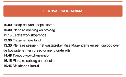 De bouwstenen voor breedvormend onderwijs staan gedurende het festival centraal in workshops en plenaire sessies. Je kiest uit een groot aantal verschillende workshops om actief en op jouw manier in het gesprek te stappen rondom de vraag: wat heb jij – hebben wij – te doen om breedvormend onderwijs verder te brengen? Klik hier voor het overzicht van de workshops.