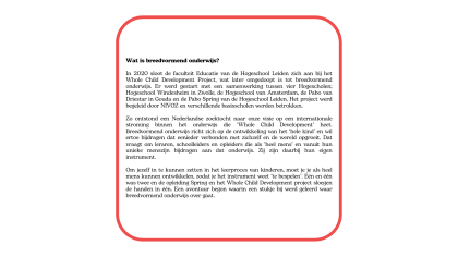 Breedvormend onderwijs richt zich op de ontwikkeling van het hele kind. Dit betekent dat er aandacht en ruimte is voor de cognitieve, sociale, creatieve, fysieke, spirituele, morele en emotionele ontwikkeling van kinderen. De afgelopen vier jaar is door de lerarenopleiding in samenwerking met het werkveld en onder de vlag van NIVOZ onderzoek gedaan naar wat breedvormend onderwijs inhoudt. Daarbij zijn zes bouwstenen ontwikkeld die het gesprek over breedvormend onderwijs stimuleren. In dit artikel willen we op basis van de bouwsteen ‘lerende en onderzoekende organisatie’ de vraag verkennen: “Wat vraagt breedvormend onderwijs in leiderschap en organisatie?”